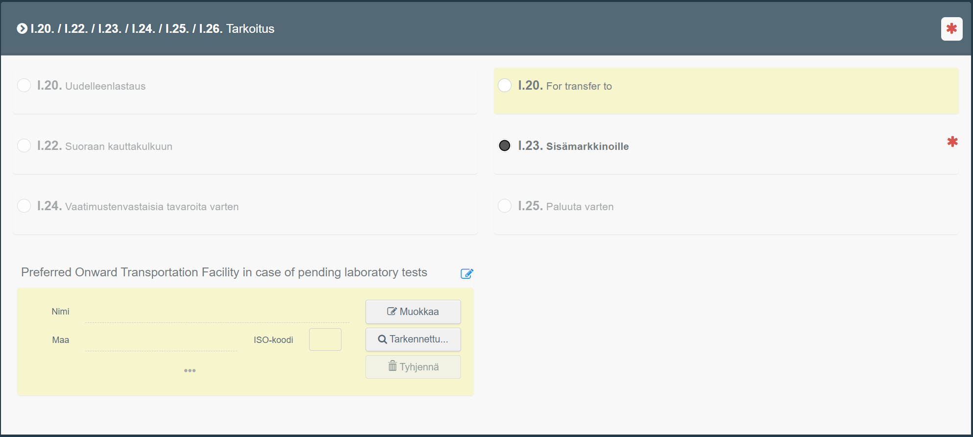 - Tieto on pakollinen, jos olet valinnut kohdassa I.20–I.26 tarkoitukseksi jonkin muun tarkoituksen kuin ”I.23 Sisämarkkinoille”.