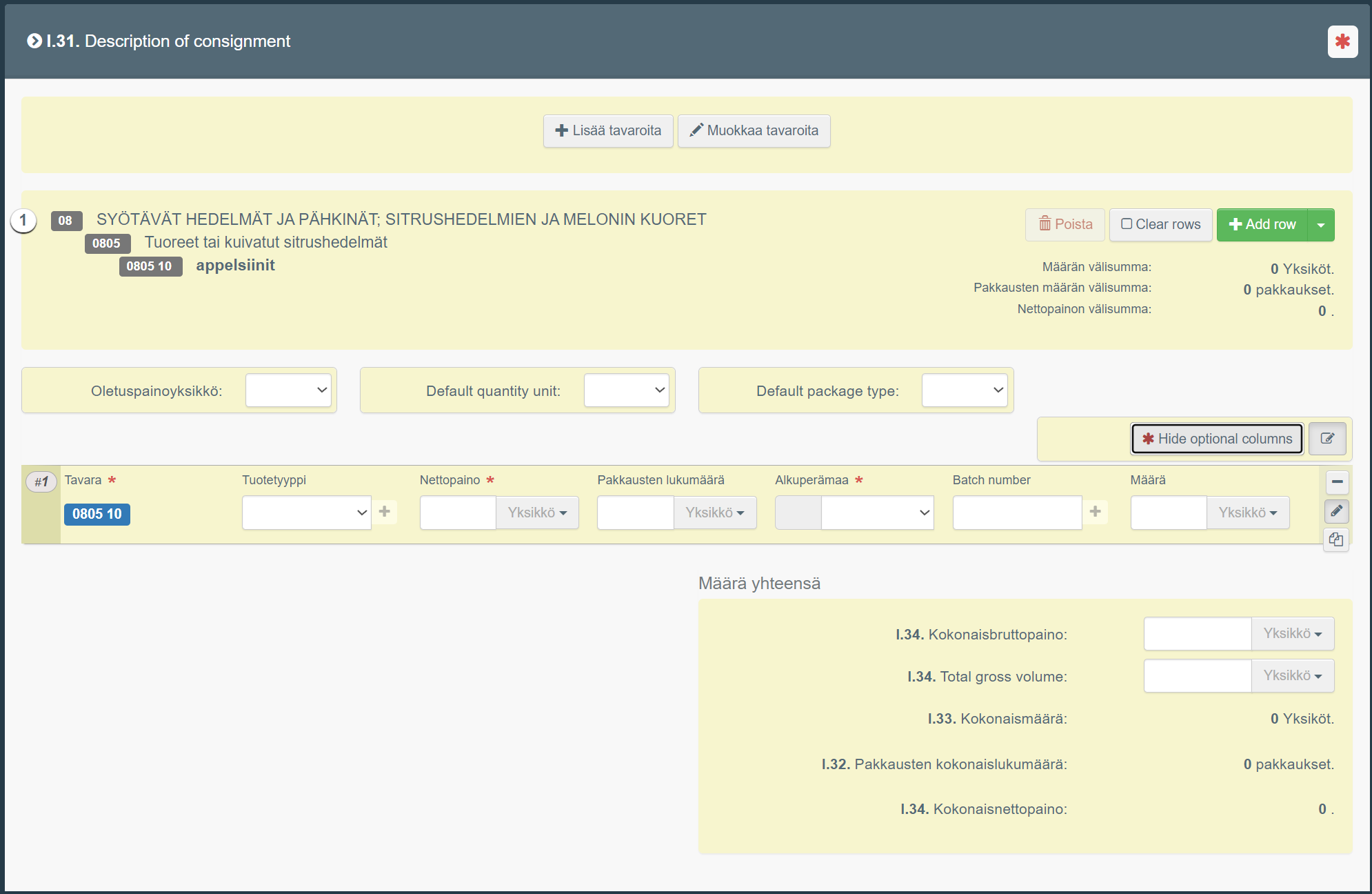 - Valitse painike ”*Show optional columns”, jotta saat näkyviin lisää täytettäviä kenttiä tavaraerän riville. Jos et pääse täyttämään tietoja, muista aktivoida rivi kynäkuvakkeesta.
