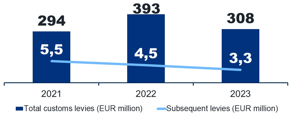 Total customs levies and subsequent levies following company and document audits (EUR million)