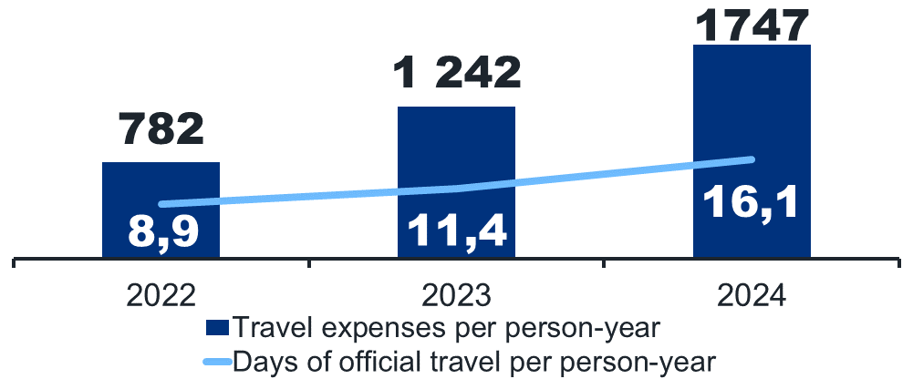 Official travel by Customs personnel increased significantly in 2024. There were 34% more official trips than before the coronavirus pandemic. Travel expenses increased mainly due to personnel from the eastern border being reassigned elsewhere in Finland, which has been the case since December 2023. The assignments result in significant accommodation and daily allowance costs, among other things, but additional funding has been secured for these. Assignments away from the eastern border will continue at least during the spring of 2025.