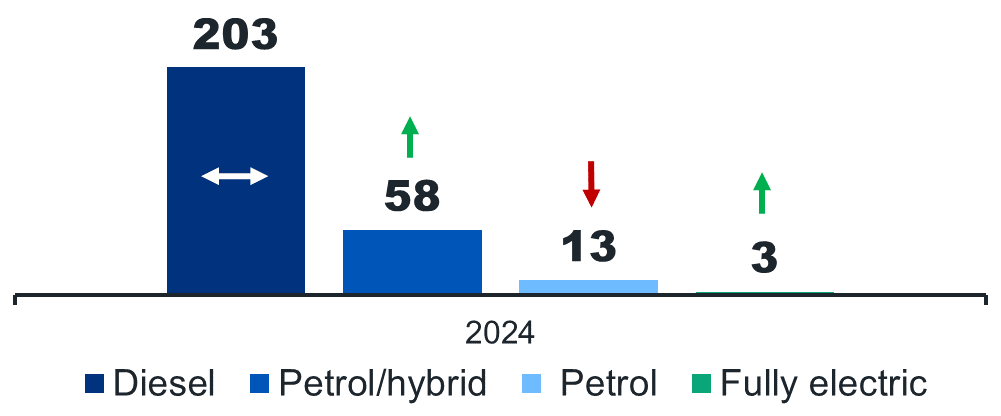 In 2024, the average emissions of official cars owned by Customs were 124 g/km, the average age was 9.9 years and the average fuel consumption was 4.9 l/100 km.