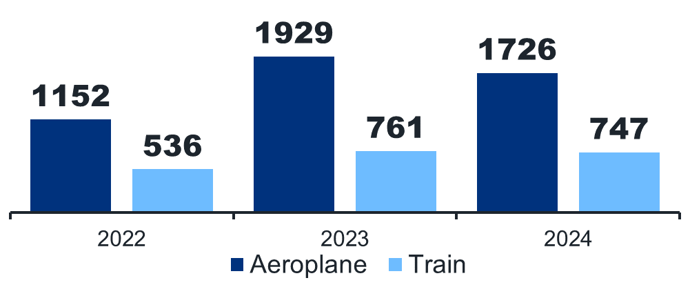 The target is to increase the use of public transport for official travel and reduce the use of aeroplanes and cars. The distance flown in 2024 decreased compared to the previous year. Train travel decreased slightly compared to 2023.
