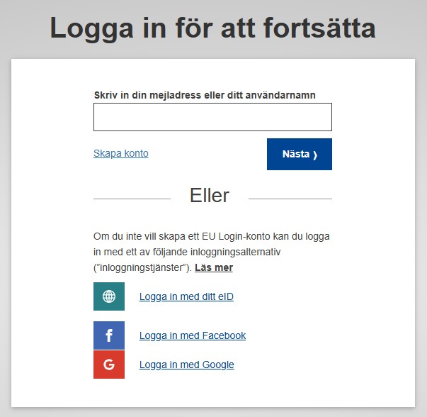 Logga in i den tjänst du vill använda via EU:s e-tjänst, autentiseringsportalen.