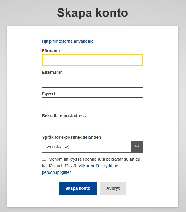 - Skicka ansökan genom att klicka på knappen ”Skapa konto”.