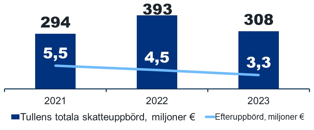 Tullens totala skatteuppbörd samt efteruppbörd till följd av företags- och dokumentgranskningar (miljoner €)