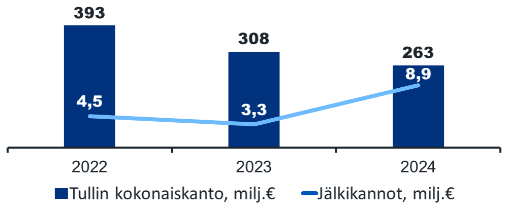Tullin keräämien verojen ja maksujen määrä vuonna 2024 oli 263,2 miljoonaa euroa, mikä on 14,9 prosenttia vähemmän kuin edellisvuonna. Laskua on tapahtunut niin EU:lle tilitettävien tullien määrässä kuin suoraan valtiolle tuloutettavien verojen ja maksujen määrässä. Tullin verojäämien osuus maksettavaksi määrätyistä veroista oli viime vuonna tulliverotuksessa 0,32 prosenttia – se alitti reilusti tavoitetason, joka oli prosentin.