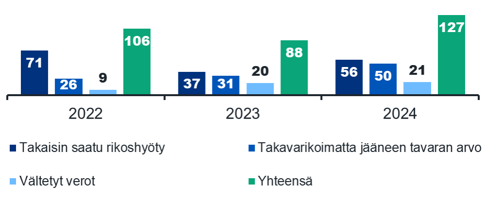 Perusmuotoisten ja törkeiden säännöstelyrikosten määrät ovat sen sijaan pysyneet korkeina. Vuonna 2024 Tulli kirjasi lähes 100 pakotteiden rikkomiseen liittyvää säännöstelyrikosta, joista 35 tutkittiin törkeinä rikoksina. Oikeusistuimissa tuomioita on annettu useista kymmenistä rikoksista.